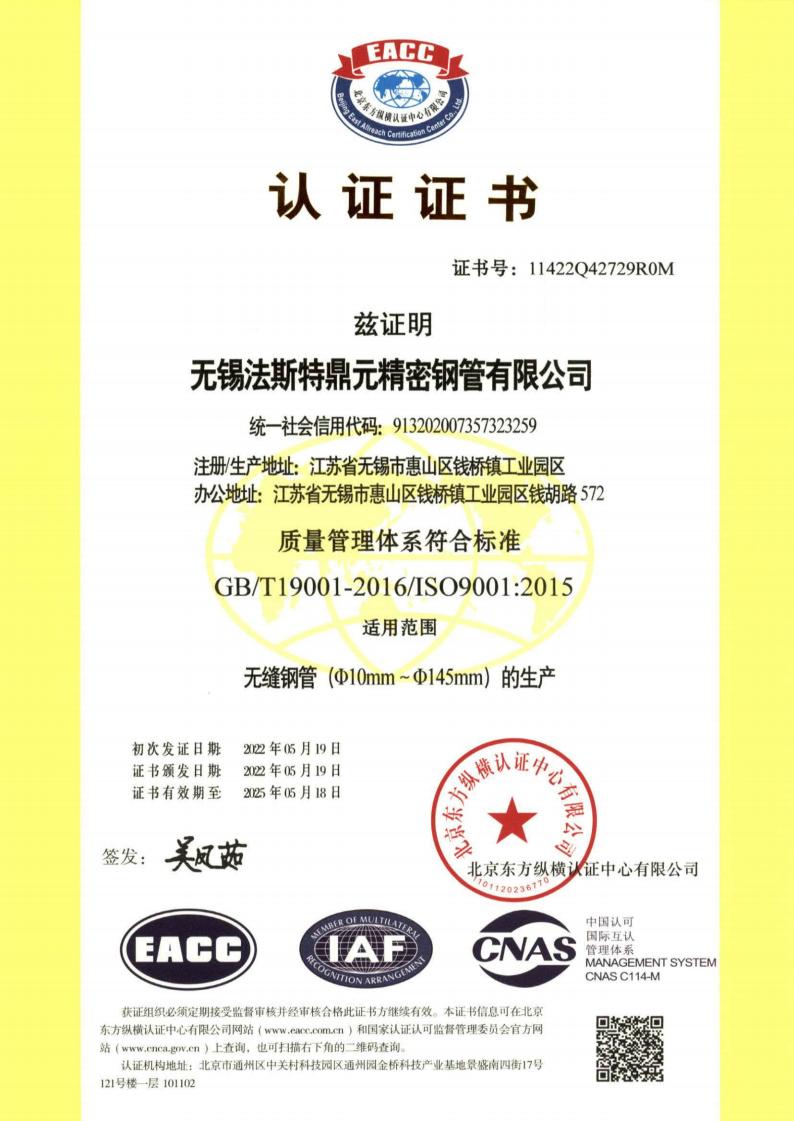 Wuxi Fast Dingyuan Precision Steel Pipe Co.,Ltd. was established in 2002 and covers an area around 64,000 m2. We are a sole proprietor focusing on precision steel pipe. We have advanced processing technic and comprehensive equipment. We are able to produce cold-drawn and cold-rolled seamless steel pipe of various material quality and sized with an external diameter of 10-144 mm and a wall thickness of 2-15 mm. The yearly production amount can hit 50,000 tons. Our products are extensively used in petrochemical, boiler, automobile, machinery, construction, electricity, boat and other industries.
