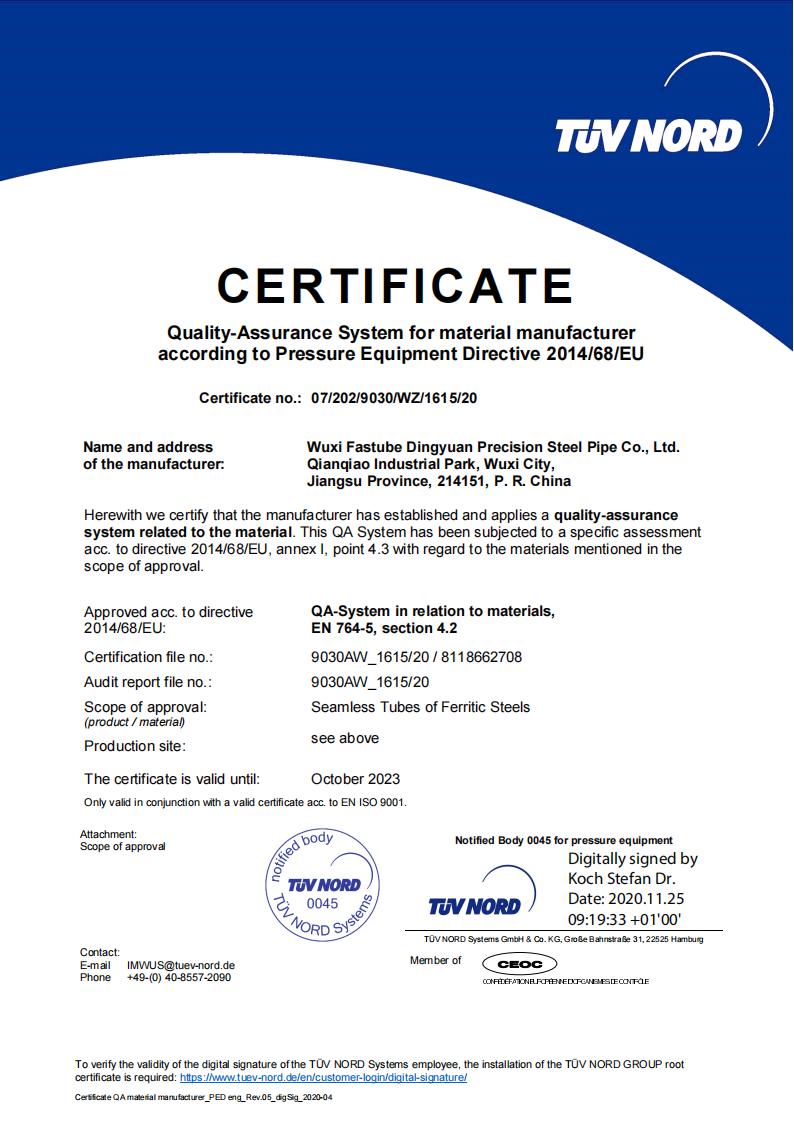 公司目前持有:中國質量認證中心CQCISO9001:2015質量管理體系認證,國家質量檢驗檢疫局TSG特種設備體系認證,歐盟TUVNORD PED 以及美國石油協(xié)會API5CT/API5L會標產品許可證。